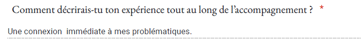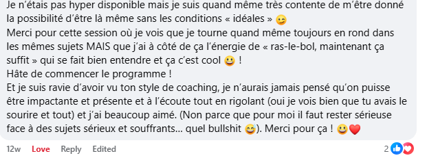 Tu es coaché·e en direct, dans ton énergie du moment. Avec ta problématique du moment (tu viens avec ce qui est juste et important pour toi - comme de l'individuel). Et puis... on ya va :) On ne reste pas au mental : on va chercher les blocages inconscients, on te reflète ta vérité, tu te réalignes, et c'est parti.