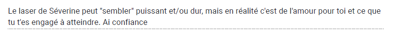 → Un coaching Laser c'est un coaching de groupe qui va droit au but en quelques minutes (mon super-pouvoir). Tu expliques, je réflète ton inconscient et on trouve ton déclic à ton soucis en quelques secondes.